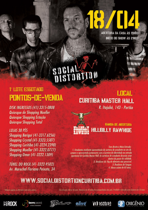 E em poucos dias o Brasil poderá conferir pela primeira vez toda a energia de uma apresentação ao vivo do Social Distortion! Mike Ness e seus asseclas chegam esta semana e se apresentam dia 15 em Porto Alegre, dia 16 no Rio de Janeiro, dia 17 em São Paulo e, fechando a tour sul-americana, em Curitiba no próximo domingo, dia 18.